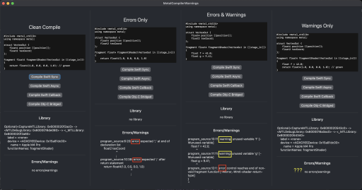 It would be great as an enhancement request to update the makeLibrary methods to instead return some kind of wrapper object/struct which contains the MTLLibrary? and diagnostics information, such as:
