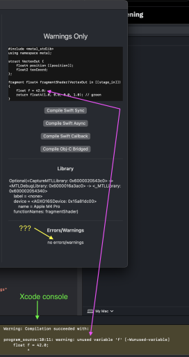 When using one of the several methods to compile an MTLLibrary from source, there is no way to receive information about compile warnings in the case that there are no errors and a library is successfully compiled. This is a problem for the use-case of writing a metal shader editor when wanting to display diagnostics.