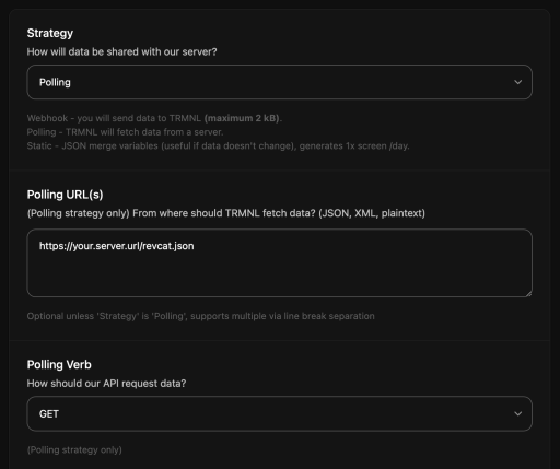 This is how to create a RevenueCat plugin for TRMNL displays. Since it involves using RevenueCat API keys, I am not able to share the plugin as a recipe. I don't want to proxy your API keys through my server, nor should you want me to see your API keys or your financial information.