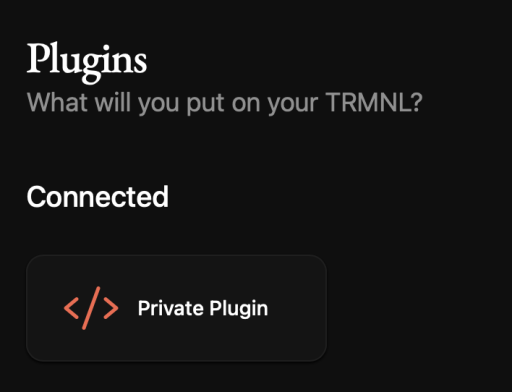 Go to your TRMNL dashboard and navigate to the Plugins section. Click "Private Plugin" and then click the "Add new" button